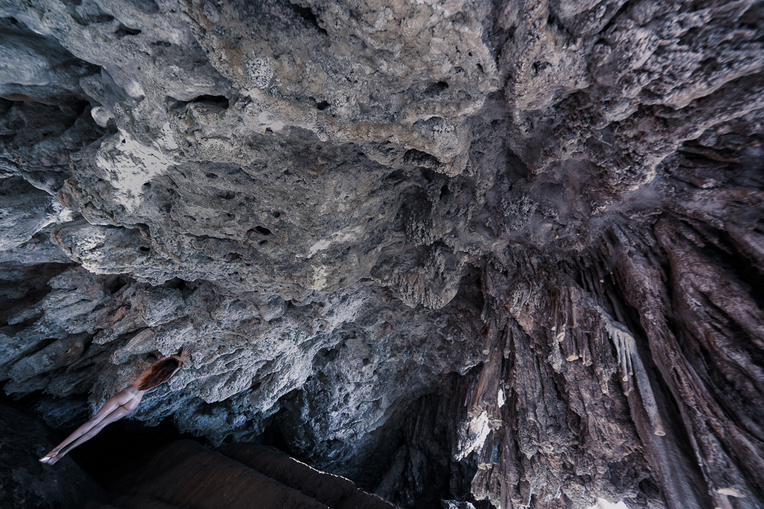 The Rosa Crepante is a crater of volcanic boulders in the form of a vast rose. The rocks are covered in moss and linens and quite soft, so soft the model could well be asleep.