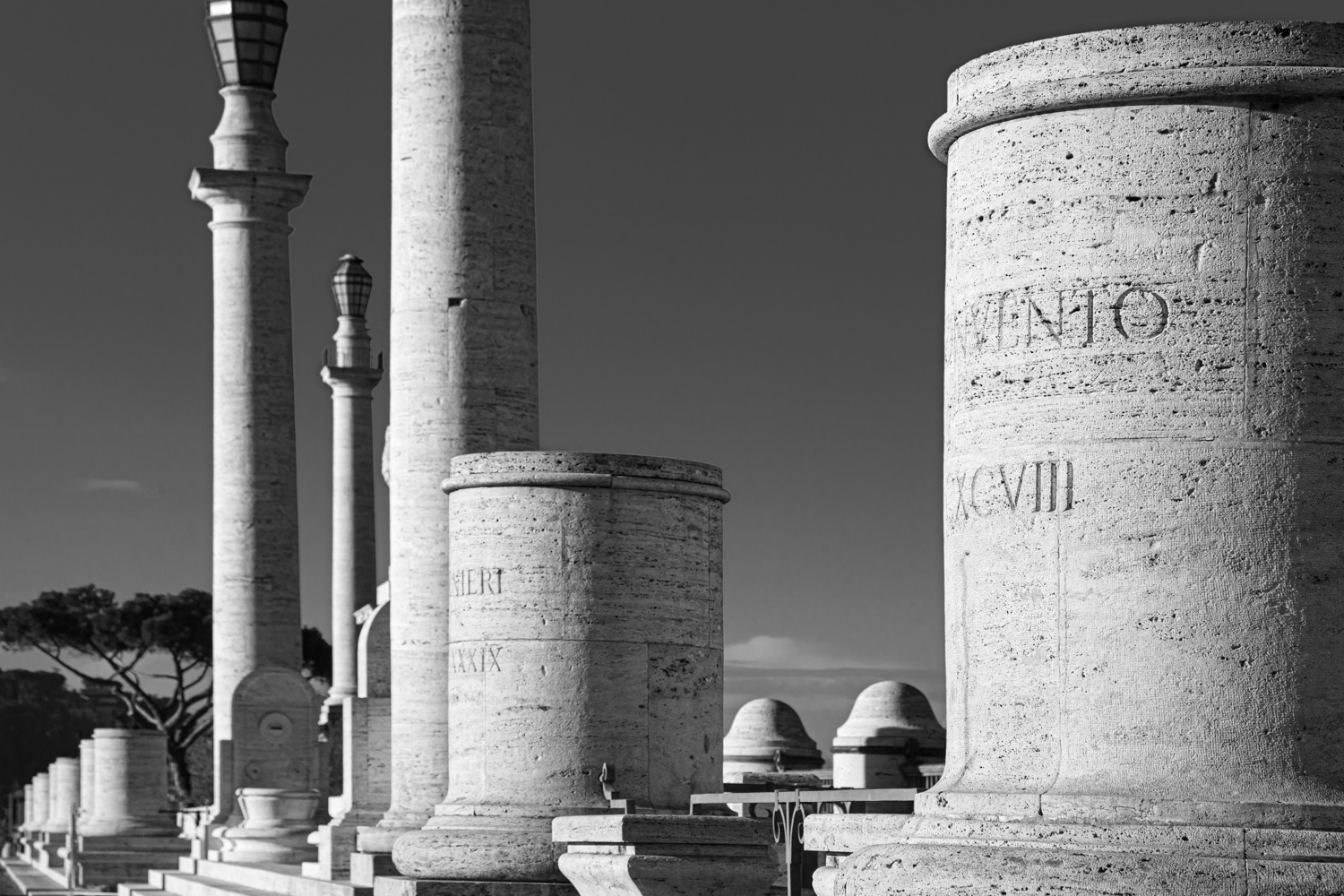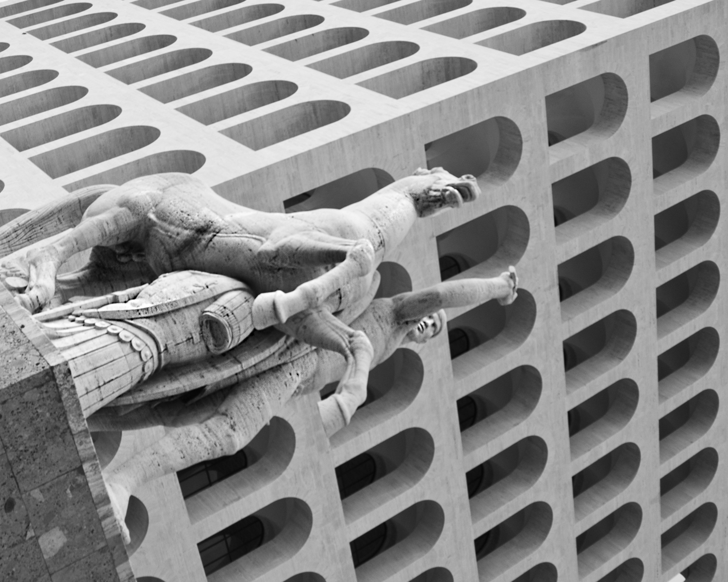 The statuary, in Carrara marble, was added from 1942 on. The statues in the arches on the ground floor, represent trades, arts and sciences, while the four equines represent the Dioscuri, Castor and Pollux. Although the building has featured in numerous films to illustrate solid Italian clerical-conservatism, I find it an extraordinary radical style of architecture rooted in the classical past. It is also most photogenic in any season or light.